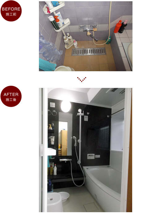 1F水廻りはタイル貼の浴室をユニットバスに取替え、洗面脱衣室も内装を 模様替えし、タオル等を収納できる棚を造り付けで新設しました。